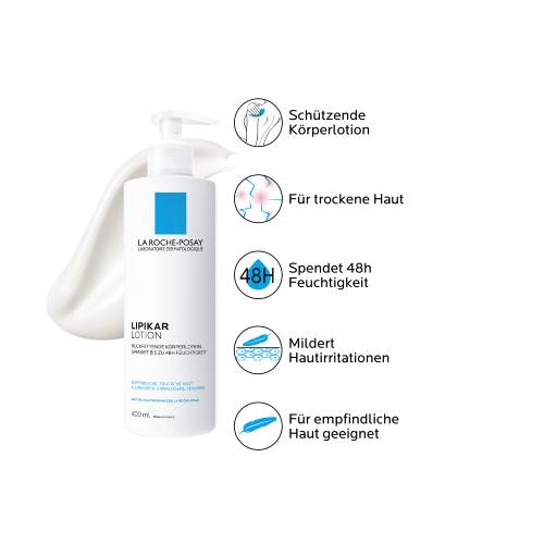 LIPIKAR Lotion für sensible, trockene und zu Neurodermitis neigende Haut Die La Roche Posay LIPIKAR Körperlotion mit Niacinamid hat die Eigenschaften einer beruhigenden Hautpflege einer rückfettenden Cold Cream und versorgt die sensible Haut sofort und bis zu 48 Stunden intensiv mit Feuchtigkeit. Zusätzlich wirkt die Körpercreme unangenehmen Spannungsgefühlen und Juckreiz entgegen und hinterlässt ein samtig zartes Hautgefühl. Schnell einziehende und nicht fettende Bodylotion Die leichte Formel der Lotion für empfindliche Haut konzentriert sich auf ein Minimum an Inhaltsstoffen und ist daher auch bei sehr empfindlicher sowie zu Neurodermitis neigender Haut gut verträglich.