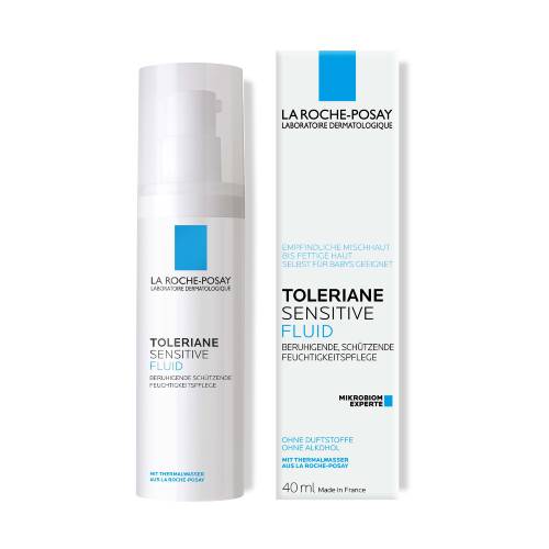 Intensiv beruhigende Feuchtigkeitspflege für fettige Haut und Mischhaut Das La Roche Posay Gesichtsfluid spendet bis zu 48 Stunden intensive Feuchtigkeit, mildert Spannungsgefühle sowie Rötungen und stärkt gleichzeitig die natürliche Hautschutzbarriere. TOLERIANE Sensitive Fluid von La Roche Posay Dank seiner wohltuenden Wirkstoffformel mit Glycerin, Niacinamid und Thermalwasser aus La Roche-Posay wirkt die leichte Gesichtspflege Rötungen, Hautirritationen und einem unangenehmen Spannungsgefühl entgegen. Die nicht komedogene Fluid-Textur ist geschmeidiger als die einer Creme, zieht sofort ein und hinterlässt ein angenehmes Hautgefühl – auch für zu Allergien neigende Haut.