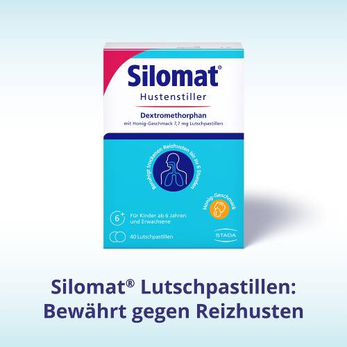 Silomat® DMP gegen Reizhusten 10,5 mg pro Lutschpastille Zur Anwendung bei Kindern ab 6 Jahren und Erwachsenen Wirkstoff: Dextromethorphanhydrobromid-Monohydrat. Zur symptomatischen Behandlung von Reizhusten. Bei Reizhusten handelt es sich um einen trockenen Husten, bei dem kein Schleim abgehustet wird (unproduktiver Husten). Hinweis: Nicht mehr und nicht länger anwenden als empfohlen. Enthält Invertzucker (aus Honig), Maltitol und Cyclodextrin(e). Zu Risiken und Nebenwirkungen lesen Sie die Packungsbeilage und fragen Sie Ihren Arzt oder Apotheker. STADA Consumer Health Deutschland GmbH, Stadastraße 2–18, 61118 Bad Vilbel Stand: Mai 2022