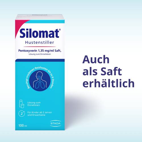 Silomat® Hustenstiller Pentoxyverin 19 mg/ml Tropfen zum Einnehmen, Lösung Zur Anwendung bei Erwachsenen und Kindern ab 2 Jahren Wirkstoff: Pentoxyverincitrat. Arzneimittel zur symptomatischen Behandlung des Reizhustens (Antitussivum). Hinweis: Enthält Propylenglycol. Zu Risiken und Nebenwirkungen lesen Sie die Packungsbeilage und fragen Sie Ihre Ärztin, Ihren Arzt oder in Ihrer Apotheke. STADA Consumer Health Deutschland GmbH, Stadastraße 2-18, 61118 Bad Vilbel Stand: Mai 2023