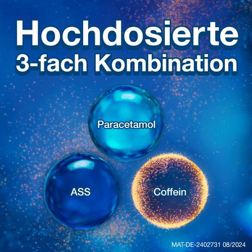Wirkstoffe: Acetylsalicylsäure, Paracetamol und Coffein. Für Erwachsene und Jugendliche zur Behandlung von akuten Kopfschmerzen (z. B. Spannungskopfschmerzen) und Migräneanfällen (mit und ohne Aura). Warnhinweis: Schmerzmittel sollen längere Zeit oder in höheren Dosen nicht ohne Befragen des Arztes angewendet werden. Enthält Lactose. Packungsbeilage beachten.