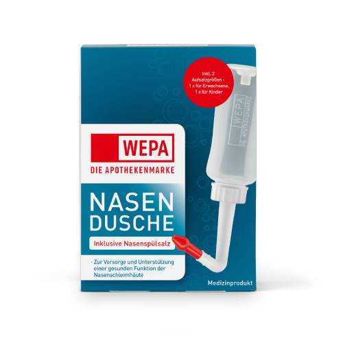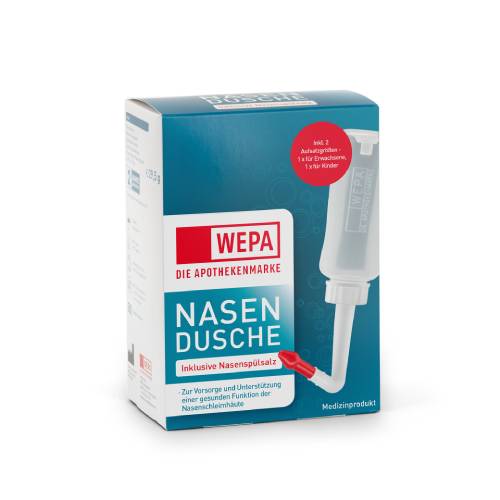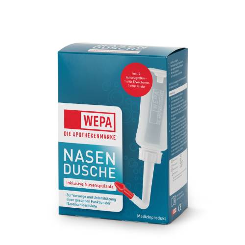 Die Nasendusche ist ein Medizinprodukt, welche als Applikationshilfe zur Spülung der Nasenhöhle mit einer Nasenspülsalzlösung eingesetzt wird. Durch die Spülung werden die Nasenschleimhaut und die Nasenhöhlegereinigt.