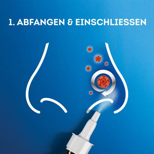 zwischen Zeige- und Mittelfinger halten. Ohne den Kopf nach hinten zu beugen, die Sprühöffnung in das Nasenloch halten und in Richtung des jeweiligen Ohres sprühen. Während des Sprühens nicht einatmen.