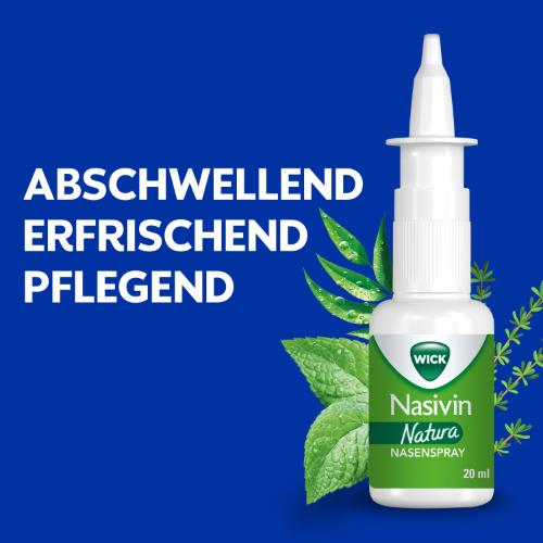 - INHALT: 1x WICK Nasivin Natura, abschwellendes Nasenspray mit Inhaltsstoffen, die zu 97 % natürlichen Ursprungs sind, hypertonische Salzlösung mit befeuchtendem ProVitamin B5, ätherischen Ölen aus Menthol, Eukalyptus und Thymian, 20 ml