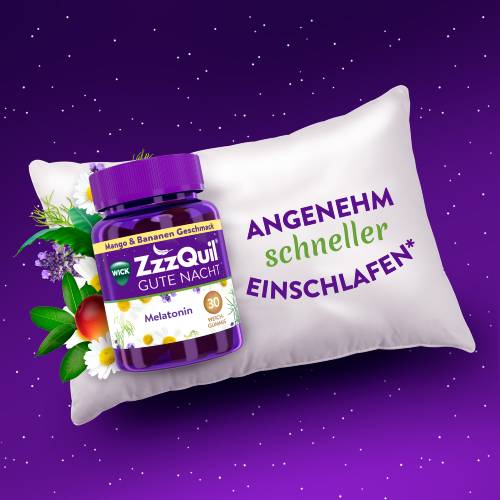 Angenehm schneller einschlafen mit den WICK ZzzQuil Gute Nacht Weichgummis mit Melatonin*. Melatonin ist ein Hormon, das das schnellere Einschlafen unterstützt, ohne dass es tagsüber müde oder abhängig macht. WICK ZzzQuil Gute Nacht enthält zusätzlich eine spezielle Kombination aus den Pflanzenextrakten Kamille, Lavendel und Baldrian. Die Weichgummis schmecken nach Mango und Banane und sind besonders einfach einzunehmen.